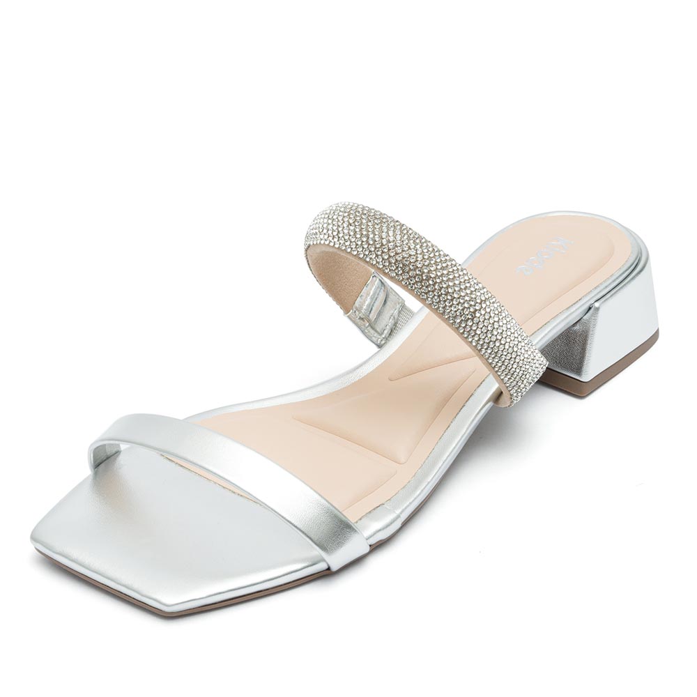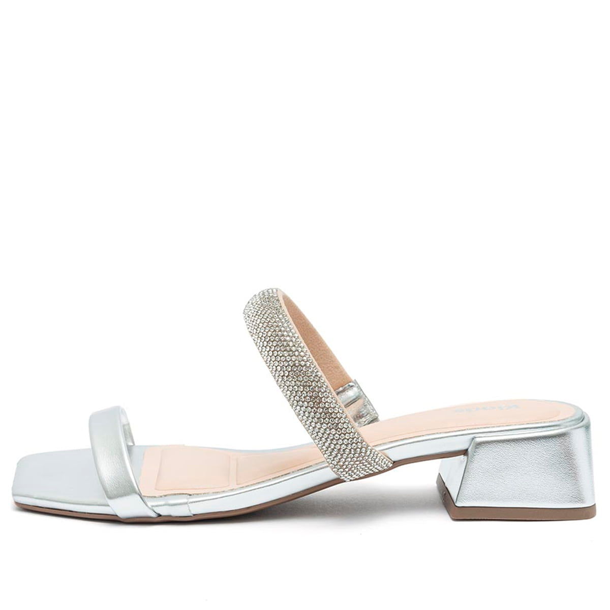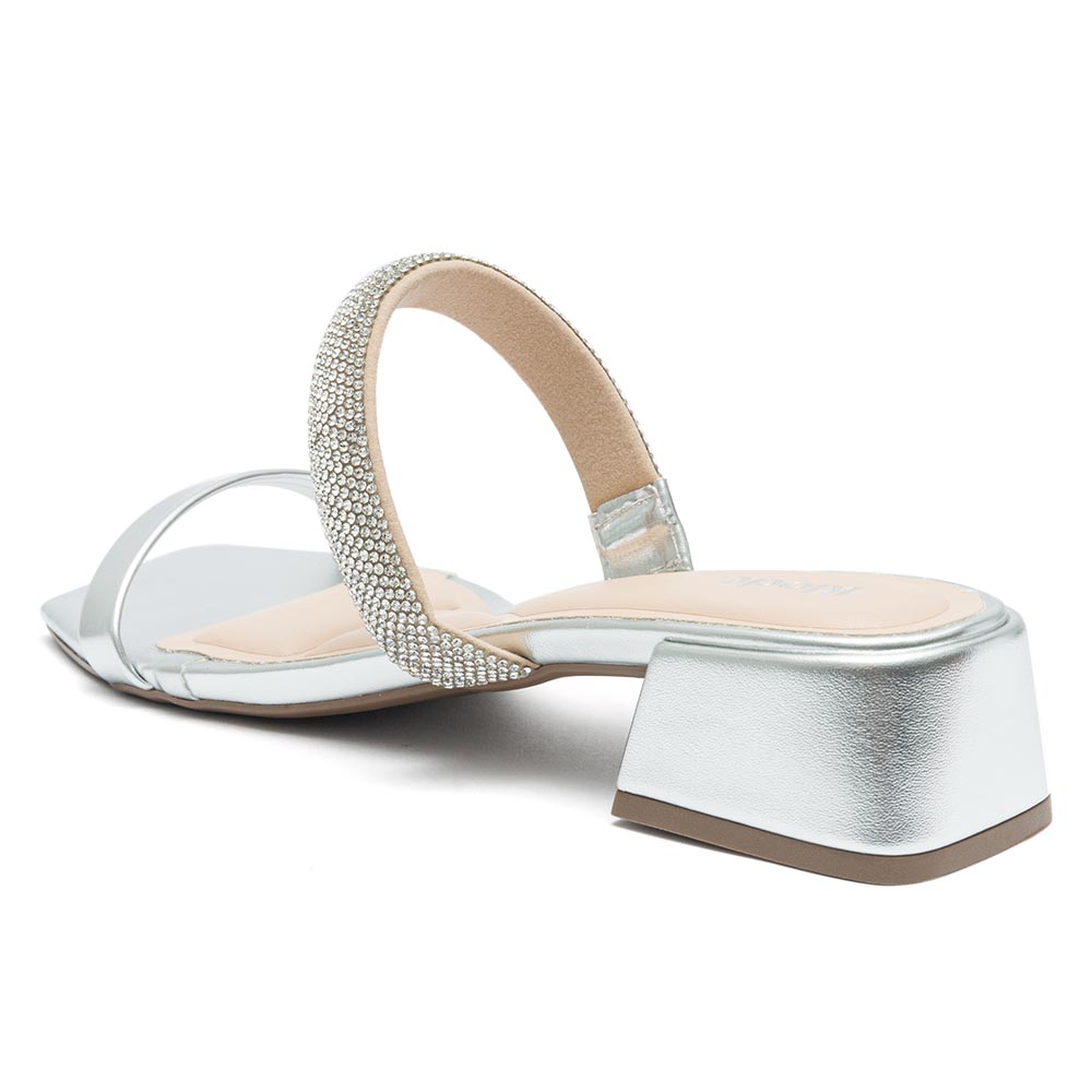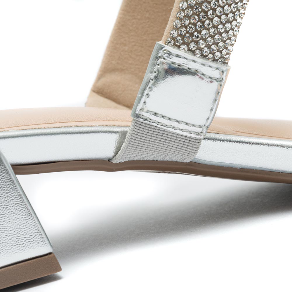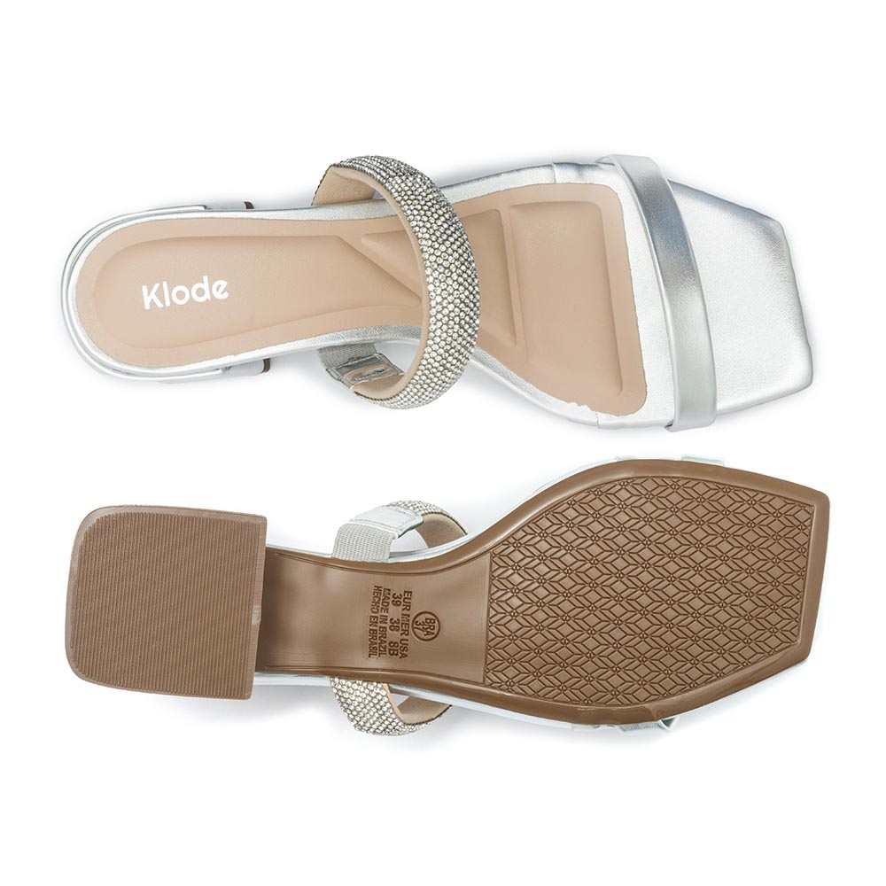 Sandália Feminina Klode Salto Grosso Prata Tira Strass